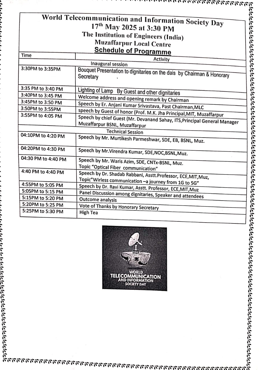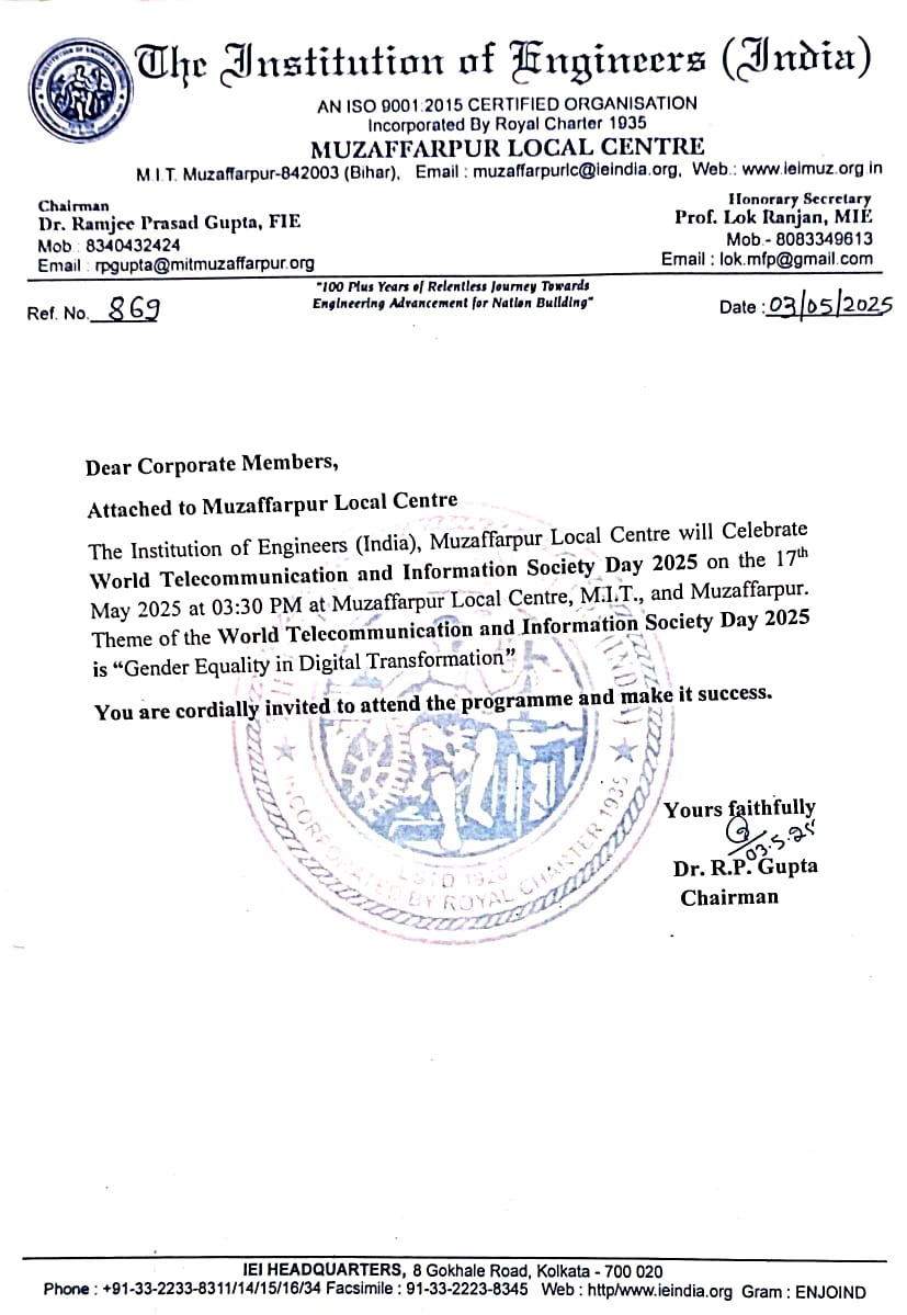 The muzaffarpur local Centre of The Institution of Engineers (I), established in 1969 at Muzaffarpur Institute of Technology, Muzaffarpur. After its establishment, it is providing a local platform where cutting-edge advancement in engineering R & D, current engineering technological ideas are shared by organizing seminar, conference, workshop, discussion on recent topic and many others technical activities. It invites eminent personalities of local area to deliver lectures on different occasions.