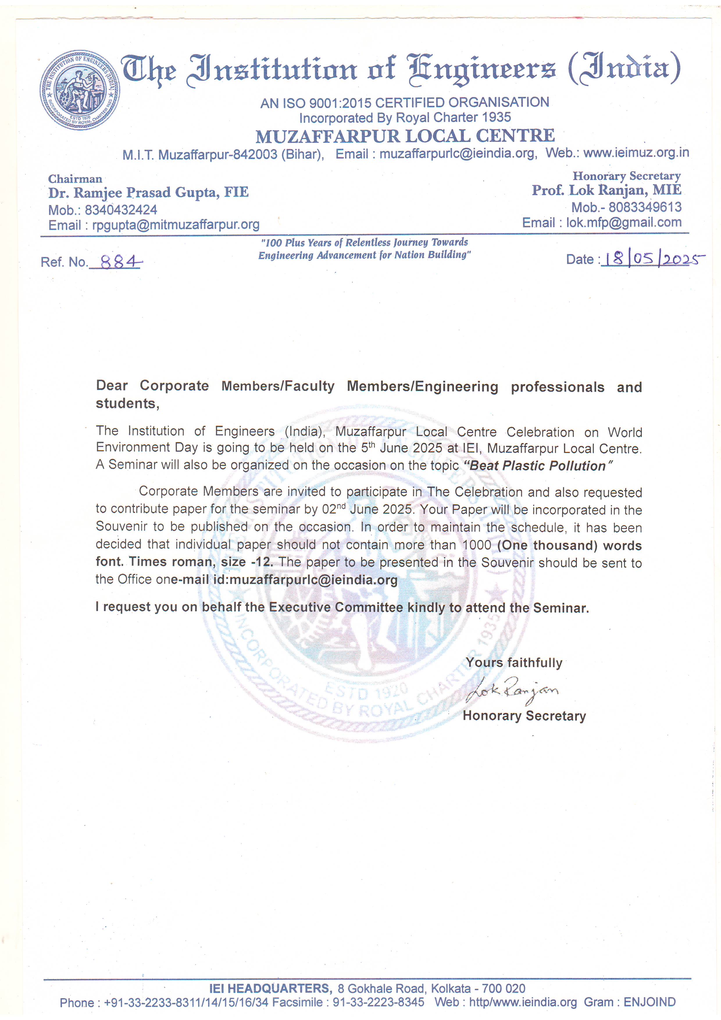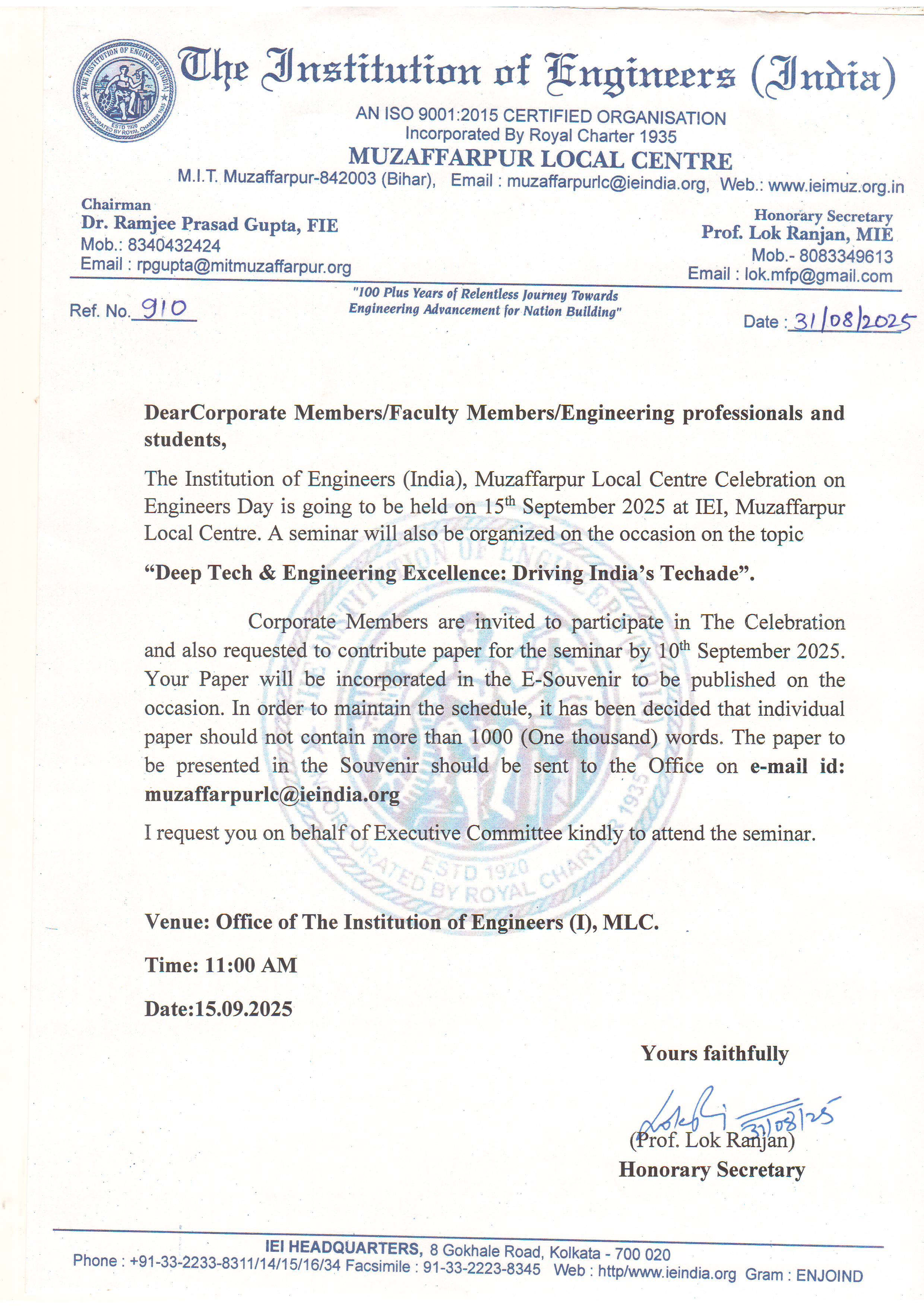 The Institution of Engineers (India) [IEI] is a statutory body to promote and advance the engineering and technology, established in 1920 and incorporated by Royal Charter in 1935.It is the largest multi-disciplinary professional body of engineers encompassing 15 (fifteen) engineering disciplines with a membership of more than 820 thousand, and serving the nation for more than 9 decades. The IEI has its headquarters located in Kolkata with national presence through more than hundred Centres and several Overseas Chapters, Foras and Organ.