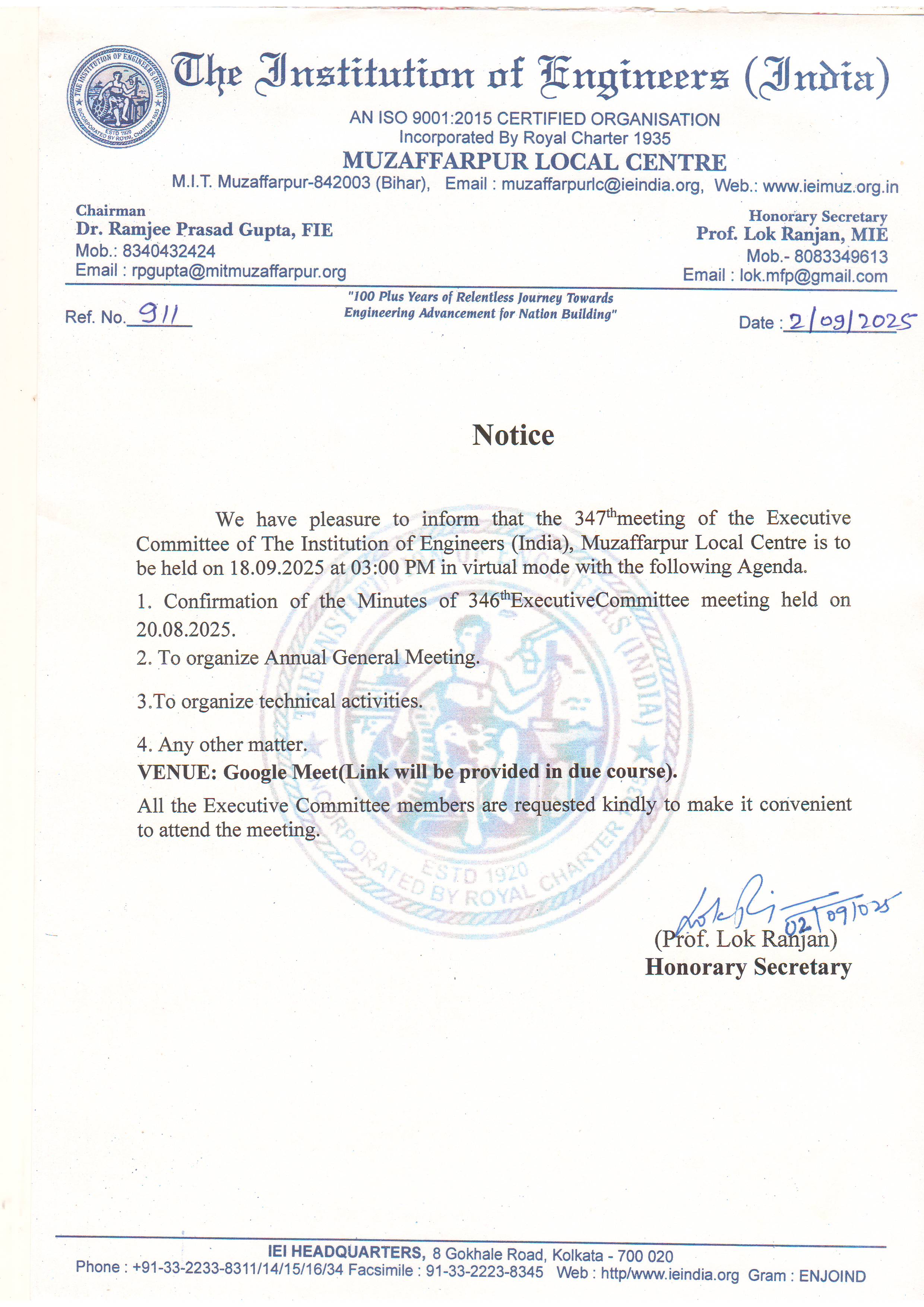 18 SEP 347 th meeting of the Executive Committee of The Institution of Engineers (India), Muzaffarpur Local Centre Office of IEI, Muzaffarpur Local Centre